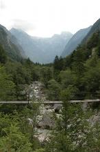 The Red Bike am Fluß Soca. Im Hintergrund sehr abenteuerliche Brücken, die man teilweise wenn man das Vetrauen in sie hat, zu Fuß evt. überqueren kann.