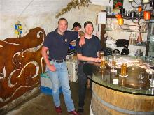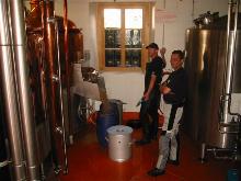 Braumeister Christian beim Austrebern, lernt den Andi an. Bierbrauer unter sich, im Keller bei der Verkostung.