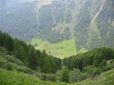 Wer kein Italienisch versteht, muß umdrehen. Straße zum Gaviapaß (2621 m), Blick nach unten. Leider kam kurz vor dem ersten Tunnel eine Baustelle wegen Erdrutsch und die Bauarbeiter ließen uns auf der noch 1 Meter breiten Straße nicht vorbei. Aber das ganze hatte auch was gutes, so nahmen wir einen Paß (auf einer Art Straße) der nicht mal auf unserer Karte verzeichnet war. Gruß an den Mini Fahrer.