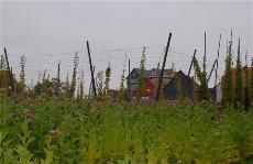 Dorfplatz am Eingangsbereich. Hopfen (Humulus lupulus)